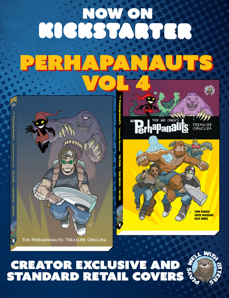 and the reason for firing it up? a NEW kickstarter!! that’s right, we’re crowd funding the PLAYS WELL WITH OTTERS self-published REMIXED and REMASTERED volume 4 of THE PERHAPANAUTS… TREASURE OBSCURA! long out of print, this new edition is a pretty radical new version, cutting some of the extraneous stuff, but adding 2025’s CHOOPIE’S BAD BAD DAY! one shot as well as an ALL NEW 8 page story following up “BIG IN BRAZIL” aptly entitled… “STILL IN BRAZIL”.